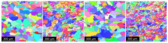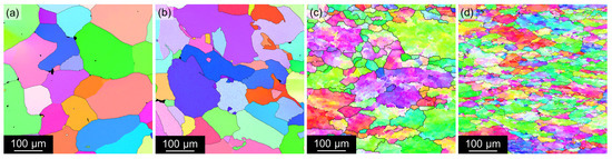 EBSD IPF maps of materials after annealing at 300 °C/30 min, 450 °C/30 min, one CGP cycle, and one solution treatment at 530 °C/30 min: (a) AlLi MC, (b) AlLiSc MC, (c) AlLi TRC, and (d) AlLiSc TRC.