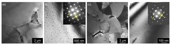 Figure 5 shows TEM images comparing MC and TRC AlLiSc alloys, where (a) and (c) display the (sub)grain structure with the location and size of coarse boundary phases, and (b) and (d) display the distribution of the -Al2Cu precipitates with corresponding diffraction patterns in zone [001] in insets. Numerous Al2Cu precipitates form in the MC material (Figure 5b), while their presence in the TRC alloy is evidenced only by the diffraction pattern.