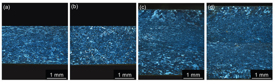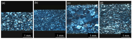 Figure 1 shows typical distributions of grains in all as-cast materials. Mold-cast materials contain almost equiaxed grains with nearly uniform grain size (Figure 1a,b). In the case of twin-roll cast material, a significantly larger surface-to-bulk region ratio led to a somewhat uneven grain size through the strip thickness: small and equiaxed grains are typical for surface and central parts. In contrast, coarser grains inclined in the rolling direction are in bands surrounding the center of the strip (Figure 1c,d). Such a structure is characteristic of twin-roll cast Al alloys, which results from faster cooling and induced deformation by rolling [48]. The role of Sc addition is demonstrated by a reduction in the grain size in both MC and TRC materials. Compared with the AlLi TRC strip, the grain size in the AlLiSc TRC alloy is more homogeneous, because the addition of Sc effectively prevents the formation of coarser grains in bands surrounding the central part.