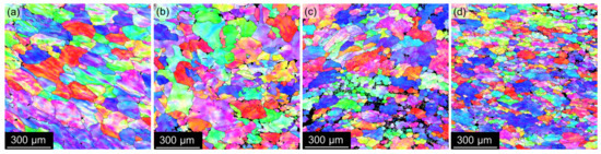 The distribution of grains in samples after one CGP cycle is shown in Figure 6. Grain refinement and more uniform grain distribution are apparent in all materials compared to the as-cast structures displayed in Figure 1.