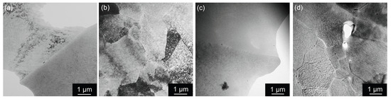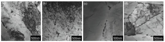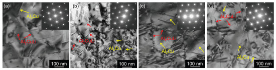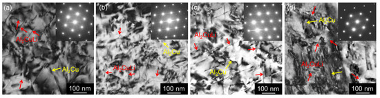 TEM micrograph of materials after annealing at 300 °C/30 min, 450 °C/30 min, one CGP cycle performed at 300 °C, one solution treatment at 530 °C/30 min, and aging at 180 °C/40 h: (a) AlLi MC, (b) AlLiSc MC, (c) AlLi TRC, and (d) AlLiSc TRC.