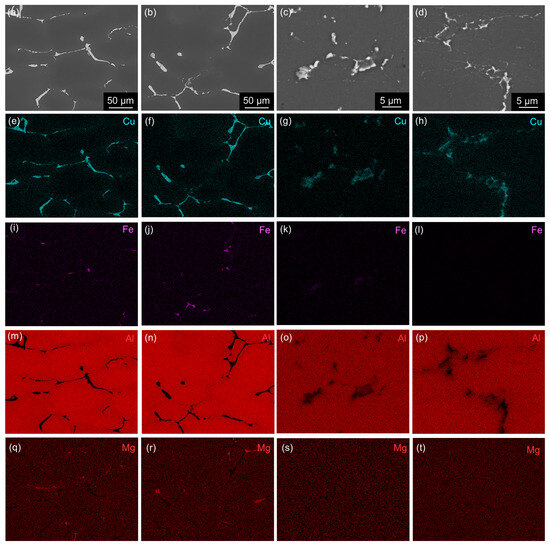 SEM BSE images and corresponding EDS maps of materials after annealing at 300 °C/30 min, 450 °C/30 min, one CGP cycle, and one solution treatment at 530 °C/30 min: (a,e,i,m,q) AlLi MC, (b,f,j,n,r) AlLiSc MC, (c,g,k,o,s) AlLi TRC, and (d,h,l,p,t) AlLiSc TRC.