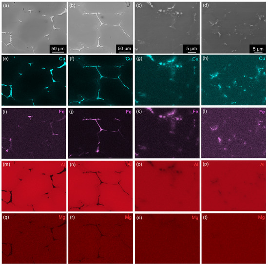 SEM BSE images and corresponding EDS maps of materials after annealing at 300 °C/30 min, 450 °C/30 min, and one CGP cycle performed at 300 °C: (a,e,i,m,q) AlLi MC, (b,f,j,n,r) AlLiSc MC, (c,g,k,o,s) AlLi TRC, and (d,h,l,p,t) AlLiSc TRC.