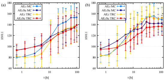 The first point was measured after solution treatment (and pre-straining for the T8 temper) and subsequent aging at 180 °C/40 min, to minimize the influence of natural aging during the necessary manipulation. At this point, the MC and TRC Sc-free graphs fully overlap, just like those of MC and TRC alloys containing Sc. This separation (Sc-free or Sc-containing ones) could result from the grain size unification and the role of subgrains. Most probably, the main contribution influencing the initial microhardness does not include the precipitation strengthening by the anticipated main strengthening phases , , , because the aging time is still noticeably short. A distinguishable increase in microhardness can be noticed after 5 h of the artificial aging in non-pre-strained materials (see Figure 13a). A significantly higher relative increase in microhardness could be noticed in Sc-free alloys. In pre-strained materials, the microhardness increases after 80 min of aging (see Figure 13b) and the peak microhardness was reached after shorter aging times than in non-pre-strained materials. Lower values of microhardness in the Sc-containing materials could be recognized.