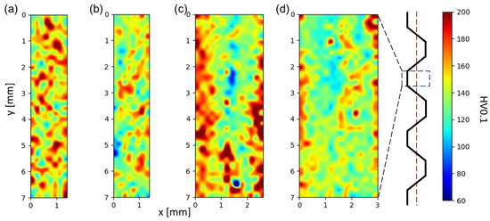 Another consequence of this short exposure of the material to high temperatures is the suppression of an intensive Li depletion in the surface layer of the strip [63,64] and the elimination of the surface sculpting typical for ingot-cast and homogenized materials. This effect is often mentioned in the literature and generally detected through microhardness measurements in alloys with higher (2–3 wt.%) Li content [65,66]. On the contrary, microhardness maps of TRC strips (Figure 14c,d) do not exhibit the presence of any systematically softer surface layer.
