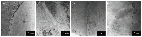 TEM micrographs of boundaries in materials after annealing at 300 °C/30 min, 450 °C/30 min, one CGP cycle performed at 300 °C, one solution treatment at 530 °C/30 min, 3% pre-straining and aging at 180 °C/14 h (near peak age condition), bright field: (a) AlLi MC, (b) AlLiSc MC, (c) AlLi TRC, and (d) AlLiSc TRC.