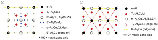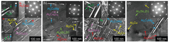 Strengthening plates (Al2Cu) in {100} planes, plates (Al2CuLi) in {111} planes, needles (Al2CuMg) elongated in <100> directions, cuboids (Al5Cu6(Li,Mg)), and spherical Al3(Zr,Sc) and Al3Zr particles were studied near zones [001] (Figure 16) and [110] (Figure 17). Selected area electron diffraction analysis based on schematical diffraction patterns shown in Figure 18 was combined with local EDS analysis and tilting experiments to identify particular precipitates. While small spherical Al3Zr (Figure 16a,c) and Al3(Sc,Zr) (Figure 16c,d) particles were formed already during the two-step annealing (300 °C/30 min + 450 °C/30 min) before CGP and further coarsened during solution annealing (530 °C/30 min), the remaining particles crystallized during artificial aging at 180 °C. Significantly sparser distributions of and precipitates in Al-Li-Sc alloys were observed in the orientation [100], particularly in the (sub)grain interiors (compare Figure 16a,c with Figure 16b,d). A closer analysis of coarse precipitates shows a prevailing formation of needle-shape -Al2CuMg particles at the expense of and plates. Cu and Mg in those particles (Figure 19) further confirm this statement.