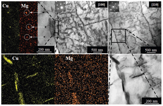 TEM images showing the same area in [100] and [110] orientations and corresponding EDS maps of needle-shaped subgrain boundary particles containing Cu and Mg. Arrows indicate Mg maps of selected particles highlighted by circles.