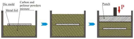 As the foundation for producing layered composites, a material with 50–55 vol.% SiC content and a relatively high residual carbon content of 30–35 vol.% was selected. This composition was chosen for its high resistance to thermal shock. In the manufacturing process, foils of Mo and Nb measuring 0.5 mm in thickness, as well as Ti foils measuring 0.4 mm thick, were utilized as the metallic component in the composite materials. These foils were arranged within molds, interspersed with layers of carbon charge comprising graphite powders in the 100–200 µm fraction range, along with a polymer binder, as illustrated in Figure 1. Subsequently, the resultant mixture underwent compression with following heat treatment to polymerize the binder.