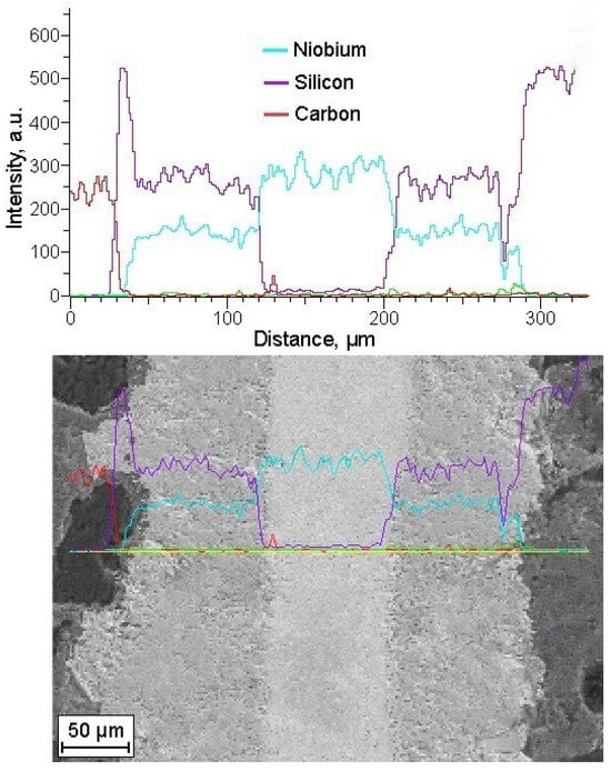 Subsequently, this process involved high-temperature treatment, during which the polymer binder underwent partial coking, leading to the development of a porous structure throughout the carbon component of the workpieces. Following this phase, the porous metal–carbon blanks underwent liquid-phase siliconization. This operation occurred within an inert environment at a temperature of 1500 °C, allowing the silicon melt to interact with both the carbon and metal elements, resulting in the creation of silicon carbide and metal silicides. Consequently, the outcome was the production of metal–ceramic blanks, showcasing a layered structure, comprising alternating layers of silicon carbide ceramics, refractory metals, and their respective silicides, which are close in terms of elastic modulus to that of SiC. Among the silicides, the molybdenum-, titanium-, and niobium-based multiphase alloys and composites were found to be the most promising [47]. They have high melting points, ability of strength retention, along with impressive oxidation resistance at elevated temperatures, which are considered desirable.