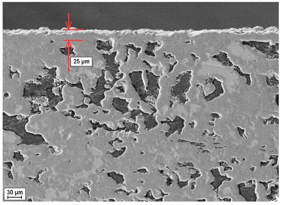 The procedure for applying a gas-tight silicon carbide coating to a substrate material relies on the direct interaction between the carbon generated during the high-temperature pyrolytic decomposition of hydrocarbon molecules (such as methane) and the silicon melt present in the surface layer of the material to be coated, along with silicon vapor. The source of silicon vapor originates from the silicon melt located in the thermal zone of the furnace [50,51]. This coating serves to prevent the high-temperature oxidation of both carbon particles and residual silicon present in the material’s structure, as well as the low-temperature oxidation of metal silicides. This stability is crucial for the extended operation of such a material within a temperature range of 600–900 °C [52,53].