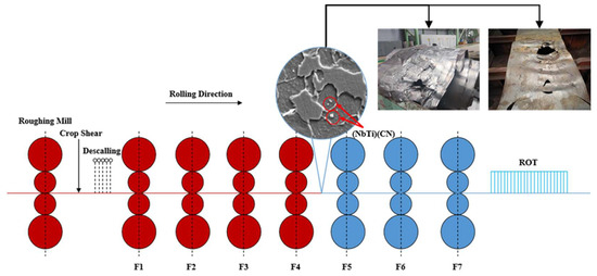 However, when producing thin-specification microalloyed strip steel with a strength level of over 700 MPa, temporary changes in working conditions such as rushed production schedules, insufficient combustion in heating furnaces, and abnormalities in the rolling process can lead to a decrease in the steel’s temperature control capability. This results in significant longitudinal and transverse temperature differentials, which can then cause accidents such as steel stack-ups and tail throwing between the mill stands [5], as shown in Figure 1. However, due to the unique characteristics of the material composition that affect product performance, the final temperature overlaps with the precipitation temperature of microalloyed steel. Therefore, the precipitation behavior of the second-phase particles will occur during the finishing rolling process. Additionally, the significant temperature difference in the transverse direction of the strip steel during widening, along with the high sensitivity of precipitation to temperature, leads to a nonuniform size and volume fraction of the precipitates. The transverse variation in the precipitates results in an uneven distribution of material deformation resistance, reducing the prediction accuracy of the traditional austenite rolling model, which neglects the influence of precipitation. This nonuniformity in the hot rolling process of microalloyed steel can cause excessive thickness or abnormal fluctuations, severely impacting product quality and stability. The purpose of this paper is to investigate the influence of the precipitation behavior of microalloyed high-strength steel on the hot rolling strip shape.
