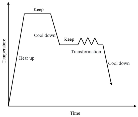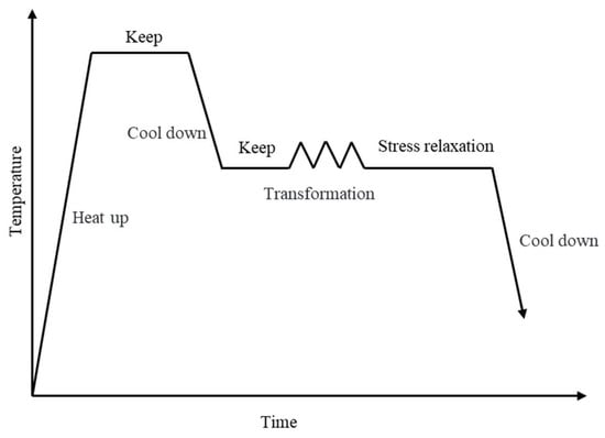 As shown in Figure 2, to begin with, the sample is heated to 1200 °C at a rate of 10 °C/s and held for 5 min to ensure complete austenitization. It is then cooled to the desired temperature (800 °C, 850 °C, 900 °C, 950 °C, 1000 °C, or 1050 °C) at a rate of 5 °C/s and held for 30 s to eliminate temperature gradients. Subsequently, the compressed deformation is performed at a set strain rate and strain rate of 1 s−1 and 60% strain, respectively. After compression, the sample is water-cooled to room temperature.
