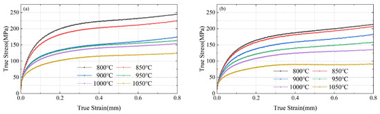 As shown in Figure 3, it can be observed that due to limitations of lubrication conditions, the sample exhibits a bulging phenomenon, leading to an upward trend of the stress–strain curve at higher strains. This increases the required pressure during compression. Therefore, when analyzing the true stress–strain curve, experimental data below a strain of 0.6 are considered. According to Figure 3, it can be seen that, due to the significant difference in Nb and Ti element content, when the temperature is relatively low and the true strain is the same, the true stress of sample 1# (a) can be approximately 20% greater than that of sample 2# (b).