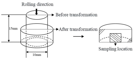 The center of the sample after stress relaxation is the microscopic observation area of the microstructure. Before observing the sample, sampling, embedding, grinding, polishing, and etching operations are required. First, sampling is conducted, and the sample deformation before and after and the sampling schematic diagram are shown in Figure 5. The sample is embedded in plastic using an embedding machine, and then grinding and polishing are performed. Finally, the surface is corroded with a reagent of hydrochloric acid (10%) and ethanol (90%), dried with a blow dryer, and then microscopic observation can be carried out.