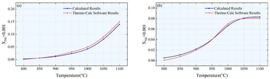 The results in Figure 6 and Figure 7 compare the Nb element molar fraction in austenite obtained from the theoretical model and Thermo-Calc 2015b software with the equilibrium molar fraction of precipitates at different temperatures for specimens #1 and #2. The small deviations may be attributed to the initial concentration calculations. Additionally, it is important to note that the calculation model only considered four elements: Nb, Ti, C, and N, while neglecting the influence of other elements. Despite these limitations, overall, our research results confirm the accuracy and reliability of the proposed calculation model.