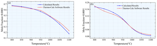 Based on the reasonable assumptions mentioned above, the precipitates can be represented as (NbxTiy)(CaNb), where the variables x, y, a, and b are the molar fractions of Nb, Ti, C, and N elements, respectively. The constraints for these variables are 0 ≤ x ≤ 1, 0 ≤ y ≤ 1, 0 ≤ a ≤ 1, 0 ≤ b ≤ 1, x + y = 1, and a + b = 1. Since NbC, NbN, TiC, and TiN share the same crystal structure, the molar ratio of the compound (NbxTiy)(CaNb) can be considered as a combination of Nb and Ti carbides and nitrides: xa mol of NbC, xb mol of NbN, ya mol of TiC, and yb mol of TiN. The thermodynamic equilibrium equation for the carbide/nitride (NbxTiy)(CaNb) can be expressed by the following set of Equation (1) [26].
