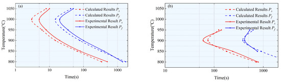 Figure 8 shows that the theoretical results and experimental results are in good agreement with Ps and Pf representing the start time and finish time of precipitation, respectively. Both Samples #1 and #2 exhibit a typical “C”-shaped PTT curve, with a nose temperature of 1000 °C for Sample #1 and 900 °C for Sample #2. The formation of precipitated phases is a spontaneous process, and the fastest precipitation temperature is determined by both thermodynamics and kinetics. When the content of Nb and Ti increases, the lattice constant of the alloy also increases, leading to an increased degree of lattice mismatch between the precipitated phases and the matrix. This increases the difficulty in kinetics, requiring higher degrees of superheating and the fastest precipitation temperature. In the stress relaxation diagram of Sample #2 at 800 °C, the corresponding precipitation end time Pf was not observed. This is because the set relaxation time of 2000 s for Sample #2 at 800 °C is too short. In the calculation model, it can be determined that the corresponding end time is approximately 3600 s.