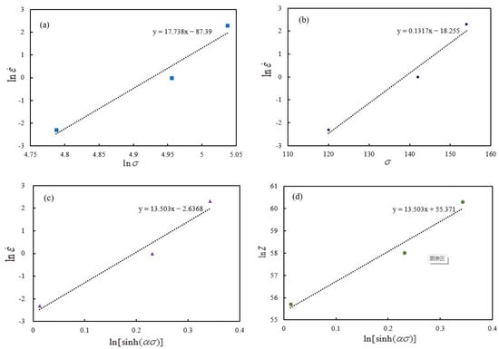 Using the Arrhenius equation to establish a high-temperature constitutive model, the Arrhenius equation has three forms: power-exponential, exponential, and hyperbolic-sine, corresponding to low-stress conditions, high-stress conditions, and all stress conditions, respectively. The effects of deformation temperature and deformation rate on deformation can be comprehensively represented by the parameter Z. As shown in Equation (7) [30].