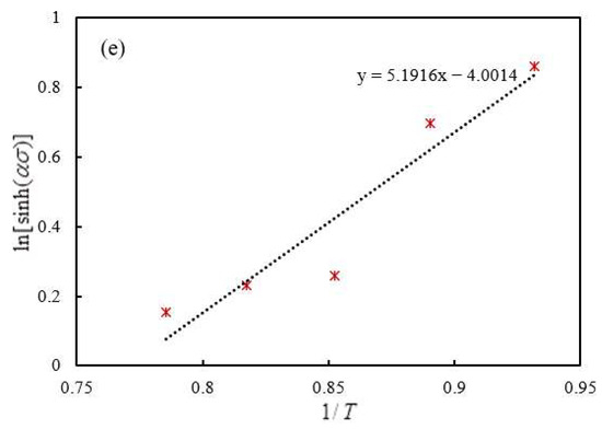 Through high-temperature compression experiments, stress–strain relationships under different conditions were obtained. Based on the established high-temperature constitutive model, the determination of material constants involves fitting the deformation of stress–strain relationships under different conditions. Ultimately, the material constants are represented by the slope or intercept of the fitted lines. The fitting results are shown in Figure 9, where (a)~(e) correspond to parameters n, β, m, A, Q, respectively.