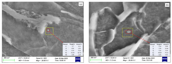 Figure 10 shows the microstructure of the precipitates observed under SEM after stress relaxation of Sample #1 at 900 °C (a) and 1000 °C (b). It can be observed that the precipitates are composite precipitates of Nb and Ti, and the size of the precipitate particles increases with increasing rolling temperature. The volume fraction of the precipitated phases increases with decreasing temperature, which is consistent with the results obtained from the calculations and analysis of the theoretical model.