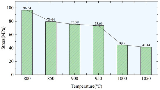 Considering that actual production is a continuous cooling process, the continuous process can be considered as a finite number of isothermal processes. The average diameter of the precipitated phases at each temperature ranges from 7.5 nm to 16.5 nm. Therefore, taking the average value of 10 nm and substituting it into the theoretical model of the strengthening effect of precipitation, the final strengthening effect is shown in Figure 11. The contribution of precipitated austenite in Sample #1 to the deformation resistance is approximately tens of megapascals, and as the temperature decreases, the strengthening effect increases. It reaches approximately 40 MPa above 1000 °C and can reach 96.6 MPa at 800 °C. By incorporating the establishment of a temperature field, the deformation resistance of microalloyed steel can be obtained at different temperatures and positions. This can be further applied to an FEM model to determine variations in the strip shape.