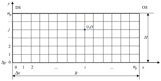 Since the length of the rolled material is much larger than its width and thickness, heat transfer in the longitudinal direction is relatively small. Furthermore, temperature control techniques in the longitudinal direction have become mature, and the temperature difference can be controlled within 10 °C. Therefore, when studying the temperature field of the strip, the heat transfer in the longitudinal direction can be neglected, and the three-dimensional problem can be simplified into a two-dimensional problem [32]. The first step is to discretize the spatial coordinates. The grid partitioning method is shown in Figure 12. B and H are the strip width and thickness, respectively. B × H cross-sectional area is divided into many rectangular grids with equal spacing Δx and Δy along the x and y directions, respectively. This generates nB and nH grids, where i is the node number in the x direction and j is the node number in the y direction.