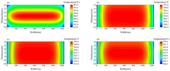 Utilizing the theory model and computational process, a temperature field calculation model for strip steel in the finishing frame zone is established using the C++ programming language. The practical process equipment parameters of a certain hot rolling production line are taken as an example to calculate the distribution of exit section temperature in four different rolling states on the F6 stand. The simulated process parameters are shown in Table 2. The calculation results are shown in Figure 13, where the four operating conditions correspond to the opening indicators of cooling water for F2, F3, F4, and F5 as (0111) (a), (1011) (b), (1101) (c), and (1110) (d). In the indicators, 1 represents open and 0 represents close.