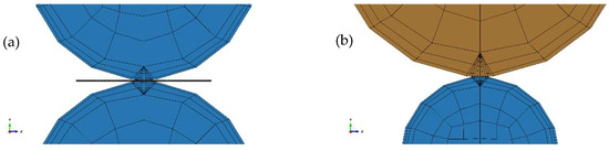 The selection of mesh element types adopts the 8-node hexahedral linear reduced integration element C3D8R. The working rolls and support rolls are partitioned using the method of locally dividing the artificial sketch. The size of the boundary elements is the same as that of the slab, while the internal mesh elements are larger. The contact surface between the working roll and support roll, as well as the boundary mesh of the steel strip, are locally refined to improve the computational accuracy. In Figure 14a,b show the mesh between the working roll and the strip, and between the working roll and the support roll. Furthermore, a set of nodes on the upper surface of the cross-section in the middle of the contour node collection of the slab is selected and created in the components for output analysis. The key parameters for the rolls and steel strip are shown in Table 3.