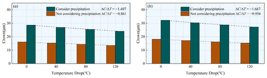 Figure 15 shows the simulated crown of a 1500 mm wide strip under different operating conditions. Figure 15a presents a comparison of the crown considering precipitation and without precipitation for operating conditions 1 and 4, with a center temperature of 1000 °C. Figure 15b displays a comparison of the crown considering precipitation and without precipitation for operating conditions 2 and 5, with a center temperature of 950 °C. In Figure 15a, when the center temperature is 1000 °C and the temperature drop is 0 °C, the stress variation of 44.7 MPa results in a crown increase of 12.46 µm. However, comparing Figure 15a with Figure 15b, with the same temperature drop of 0 °C and a temperature difference of 50 °C, only a slight increase in crown of 2.5 µm is observed. The effect of precipitation strengthening on crown is far greater than the influence of temperature reduction. In Figure 15a, when the center temperature is 1000 °C and the temperature drop is 0 °C, the difference in crown between considering precipitation and without precipitation is 12.46 µm, while at 120 °C it is 10.53 µm, reducing by 1.93 µm. In Figure 15b, when the center temperature is 950 °C and the temperature drop is 0 °C, the difference is 14.1 µm, while at 120 °C it is 11.96 µm, reducing by 2.14 µm. This indicates that the lower the overall temperature of the strip, the greater the influence of precipitation strengthening on the uneven distribution of thickness in the strip, and due to the lower temperature at the rear racks, it is more prone to shape issues under the influence of precipitation strengthening.