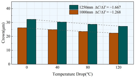 As shown in Figure 16, the simulation results illustrate the crown under different widths for working conditions 2 and 3. The narrowing of the width of the strip leads to the application of the same tension on a smaller cross-sectional area. Consequently, the range of the internal tension is reduced, resulting in a weakened effect of the internal tension. Simultaneously, this also causes an imbalance in the lateral forces, thereby reducing the bending stiffness of the strip and overall decreasing its crown. Under the influence of reinforcement, the resistance to deformation in the marginal area increases, providing a stronger resistance against deformation. Similarly, the changes in crown caused by the same temperature drop are relatively small. When the width is 1250 mm, the crown change caused by temperature drops of 0 °C and 120 °C is 5.01 µm, whereas it is 3.80 µm when the width is 1000 mm. Furthermore, the absolute value of ∆C/∆T increases by 31.47% when the width is 1250 mm compared to when it is 1000 mm, indicating a decreased sensitivity of crown to temperature drops as the width decreases.