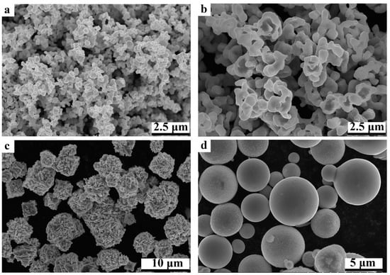 Raw powders of WC, Co, Ni and HEA: (a) WC; (b) Co; (c) Ni; (d) HEA.