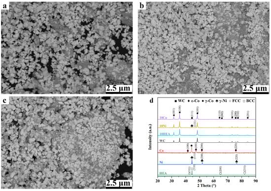 Mixed raw powders of WC-based cermets with different binder phases: (a) SEM micrographs of WC-10Co; (b) SEM micrographs of WC-10Ni; (c) SEM micrographs of WC-10HEA; (d) XRD patterns.