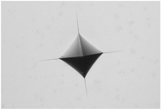 The densities of all sintered samples were measured using the Archimedes’ principle method. The hardness was tested on Vickers hardness tester with a load of 30 kg and dwelling time of 15 s. At least 10 positions were randomly tested to acquire the average value of the hardness. A three-point bending test was performed to evaluate the transverse rupture strength (TRS), according to the standard of GB/T 6569-2006 [31]. The specimens for three-point bending test had dimensions of 3 mm × 4 mm × 20 mm [32]. Figure 3 shows the image of Vickers indentation with cracks propagating from the corners. The fracture toughness of the sintered cermets was measured using the indentation method. By measuring the crack length on the corner of the indentation, the fracture toughness can be calculated with the following equation [33]: