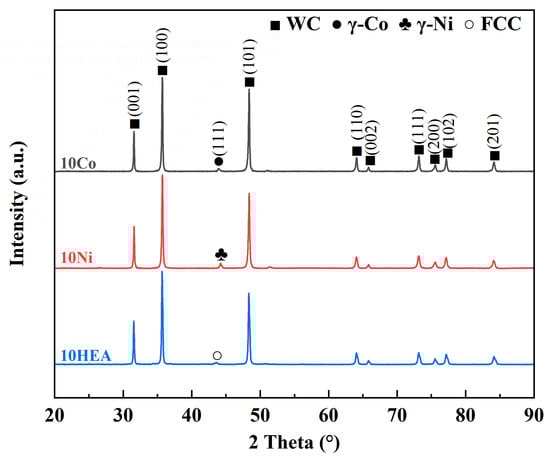 To identify the phase composition, Figure 4 shows the XRD patterns of WC-based cermets with three kinds of binder phases. It reveals that the as-sintered WC-based cermets are mainly composed of WC and binder phase, which is consistent with the mixed powders before sintering. For WC-10Co, WC-10Ni and WC-10HEA, the binder phases are indicated as Co, Ni and FCC phases, respectively. This result agrees well with that of Luo et al. in which WC-20HEA bulk was also composed of WC and HEA [11]. No other carbides or oxides can be detected for all three sintered samples due to the rapid sintering using the SPS method. On the other hand, this result implies that the as-prepared ultra-fine grain WC-based cermets have good mechanical properties due to the absence of impurities with low strength [9].