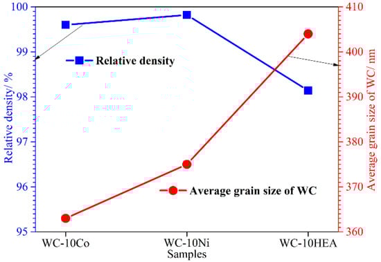 Furthermore, the average grain size of WC particles was measured, as shown in Figure 6. Firstly, the average grain size is lower than 410 μm for all three cermets, indicating that the sintered samples belong to the ultra-fine grain WC-based cermet [34]. The fine WC size is beneficial in improving the mechanical properties of the cermets [35]. By comparison, the size of WC gradually enlarges when the binder phase varies from Co to Ni and AlCoCrNiFeCu HEA. This phenomenon is exactly consistent with the observation in Figure 5. According to the Hall–Petch equation [36], strength and hardness have a tight relationship with the grain size. Therefore, the relatively higher WC grain size is supposed to be detrimental to the bending strength and hardness of WC-10HEA [37]. In addition, relative density is also a key factor affecting the bending strength of WC-based cermets. Therefore, the relative density for the three cermets were measured, as shown in Figure 6. The relative densities of WC-10Co and WC-10Ni are much higher than that of WC-10HEA. This may be attributed to the worse surface wettability of the AlCoCrNiFeCu alloy [23]. Likewise, the lower density is harmful to the mechanical properties of WC-based cermets [38].