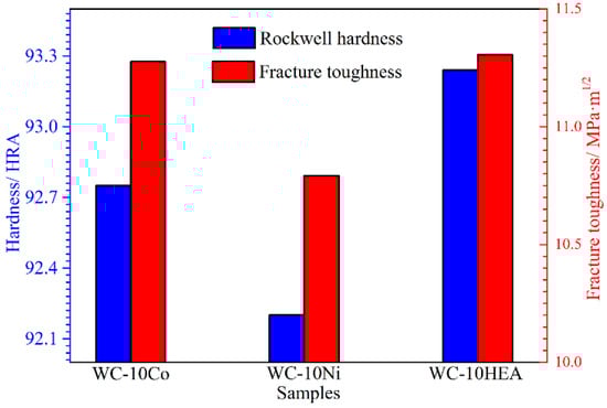 Hardness and toughness are the important factors for the wear performance of samples. Figure 7 shows the hardness and fracture toughness of WC-based cermets with different binder phases. Compared to WC-10Co, the hardness of WC-10HEA can be improved from 92.75 to 93.24 HRA, while the hardness of WC-10Ni decreases to 92.2 HRA. In spite of the lower relative density and larger grain size, WC-10HEA shows the highest hardness. On the one hand, the hardness of AlCoCrNiFeCu HEA is higher than that of Co and Ni [25], which contributes to the higher hardness of WC-10HEA. On the other hand, the appearance of a newly Al-Cr rich phase may also be conducive to improving the hardness. For all three cermets prepared using the SPS method in this work, the Rockwell hardness is basically higher than 92HRA, which is the important factor for guaranteeing superior wear resistance [39,40].