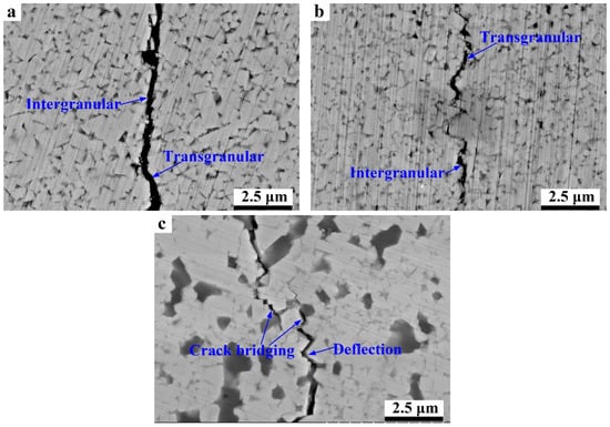 In addition, WC-10HEA shows the highest fracture toughness of about 11.3 MPa·m1/2, as exhibited in Figure 7. By comparison, WC-10HEA possesses both superior hardness and fracture toughness than traditional WC-10Co. Given this result, it can be concluded that WC-10HEA is supposed to have excellent wear resistance. However, the fracture toughness of WC-10Ni is much lower than that of WC-10Co. To further unravel the toughening mechanism, the crack propagation path was observed, as shown in Figure 8. The cracks not only propagate along the grain boundaries of WC but also pass through WC particles. As for WC-10Co and WC-10Ni, it can be observed that the cracks mainly travel along the boundaries of WC particles. Nevertheless, the crack deflection and bridging are very evident for the WC-10HEA cermet. Generally, the cracks’ deflection and bridging are conducive to improving the fracture toughness of ceramics, due to the consumption of energy [32,41]. In WC-10HEA, WC particles are much coarser, so that the crack has to propagate a long distance to bypass them. Furthermore, a crack-bridging phenomenon seems to appear when meeting the Cr-Al rich phase. The two factors are supposed to account for the superior fracture toughness of WC-10HEA.