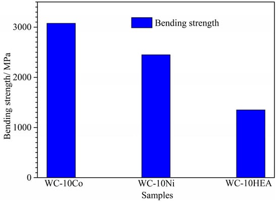 Furthermore, the bending strength of the three WC-based cermets with different binder phases is shown in Figure 9. By comparison, WC-10Co shows the highest bending strength, while WC-10HEA shows the lowest value. This indicates that the substitution of HEA for Co is detrimental to the bending strength of WC-based cermet. The bending strength of WC-10Co reaches 3075 MPa by utilizing the present technique with the SPS method. However, the bending strength of WC-10HEA is only half of that of WC-10Co, with the value of about 1350 MPa. According to the above analysis, the relative density is the lowest and the size of WC particle is the largest, both of which are harmful to the bending strength of WC-10HEA [42]. In addition, the poor wettability may also be an important reason, considering that the pulling out of WC particles is the main fracture mode. Therefore, it is essential to further improve the bending strength of WC-10HEA cermet to extend its industrial applications.