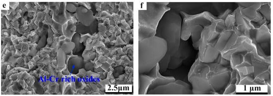 To disclose the fracture mechanism during the bending test, the fracture surfaces of all three cermets were observed, as shown in Figure 10. From the fracture surfaces, it can be seen that the WC-10HEA sample has the largest WC grain size. Furthermore, both transgranular and intergranular fractures can be observed on the fracture surfaces of the WC-based cermets. For WC-10Co and WC-10Ni, the fine particles tend to pull out from the binder phase, while the coarse particles tend to fracture during the bending process. The is because the WC phase has a low fracture toughness, so that it is easy to fracture during the bending process [1]. Therefore, the intergranular fracture phenomenon is more common in the WC-10HEA cermet, which is bad for the bending strength. In addition, it can be clearly seen that the black oxides in WC-10HEA have weak bonding to the WC particles. Thus, cracking is supposed to preferentially originate from these sites due to the high tendency of stress concentration. In this case, it is to be expected that the bending strength of WC-10HEA is the poorest, considering the coarsest grain and detrimental oxide phase.
