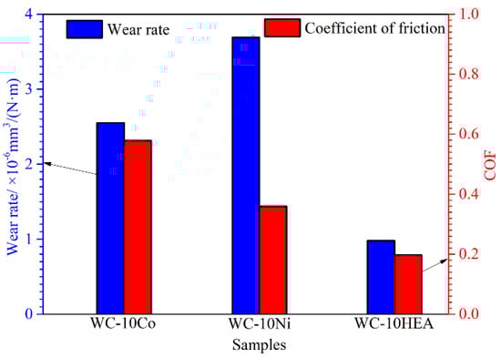 By testing the dry sliding wear properties of the cermets, the wear rate and coefficient of friction (COF) of WC-based cermets can be obtained, as shown in Figure 11. By comparison, WC-10HEA shows the lowest wear rate of 0.98 × 10−6 mm3/(N·m) and COF of 0.196. Compared to WC-10Co, the wear rate and COF decrease by 45.3 and 65.5% for WC-10HEA, respectively. Likewise, the wear rate and COF of WC-10HEA decrease by about 74.0 and 45.4%, respectively. Thus, it can be concluded that WC-based cermet with AlCoCrNiFeCu HEA binder phase has superior friction and wear properties. Especially, there is a self-lubricating effect for WC-10HEA compared with the traditional WC-based cermets with Co and Ni binder phases [43]. Table 2 lists the comparative results of the microstructure, mechanical properties and wear properties of WC-based cermets with different binder phases. As seen, WC-10HEA possesses the highest hardness and fracture toughness, which is beneficial in improving wear resistance. Simultaneously, AlCoCrNiFeCu HEA binder phase and its oxides during the wear process can play a crucial role in reducing the COF [44]. Consequently, the wear rate of WC-10HEA can be greatly decreased compared with the WC-10Co and WC-10Ni samples. This is important to improve the application properties of WC-based cermets as machining and molding tools.