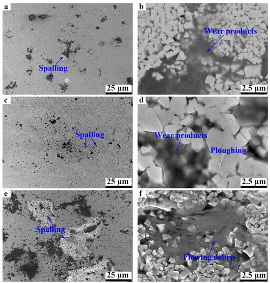 To unravel the wear mechanisms of different cermets, the wear surfaces were observed for all three cermets, as shown in Figure 12. Ploughing dominates the wear process of WC-based cermets during dry sliding against a Si3N4 counter, despite the wear tracks not being clear [24,45]. From the magnified morphology in Figure 12d, a few ploughing furrows can be observed, which confirms the main damage form of ploughing. Furthermore, a few peeling pits can be found distributed all over the wear surface of WC-based cermets, which may be the reason for the increase in the COF. It is common knowledge that higher surface roughness contributes to a higher COF. From the magnified micrographs, it can be found that the pits are filled with some dark wear products. According to the EDS analysis in Table 3, the wear products are mainly composed of O, W and Si elements for WC-10Co. Thus, the wear products are supposed to be oxides of wear products due to the thermal effect during the wear process. Generally, the existence of oxides on the wear interface can play a positive role in reducing the COF [45,46,47]. On the other hand, it can be concluded that the cermet and Si3N4 disk can be simultaneously abraded during the dry sliding process owing to the existence of Si inside the wear products.