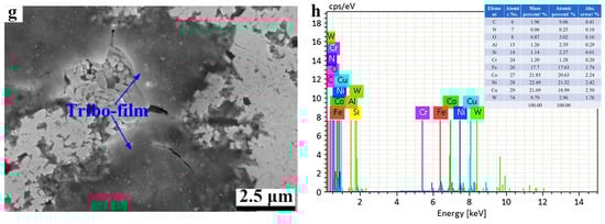 Wear surfaces of WC-based cermets with different binder phases: (a,b) WC-10Co; (c,d) WC-10Ni; (e–g) WC-10HEA; (h) EDS analysis of the tribo-film of WC-10HEA.