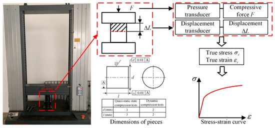 The strain rate of the quasi-static compression test is set to 0.001 s−1 and the compression rate can be obtained as 0.18 mm/min according to Equation (1). The compressive force F and displacement ΔL are obtained by the pressure transducer and displacement transducer, and the true stress σr and true strain εr of the material in the process of compression deformation can be obtained according to the size of the sample. To ensure the reliability of the data, three repeated tests were carried out for each specimen, and the average value was obtained.