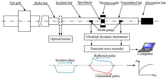 The SHPB equipment system is schematically illustrated in Figure 2. To obtain a higher strain rate, the diameter of the incident bar and the transmitted bar is reduced to 5 mm. By adding different air pressures to the gas bar to change the speed of the strike bar, different strain rate conditions are achieved. Considering the softening effect of high temperature on the material, the same strain rate can be achieved by appropriately reducing the air pressure. Different loading temperatures are controlled by the thermocouple. To make the sample fully heated, it is necessary to carry out heat preservation treatment. In addition, the error caused by the friction between the specimen and the compression bar is reduced by uniformly applying a high-temperature-resistant lubricant on the contact surface between the sample and the rod.