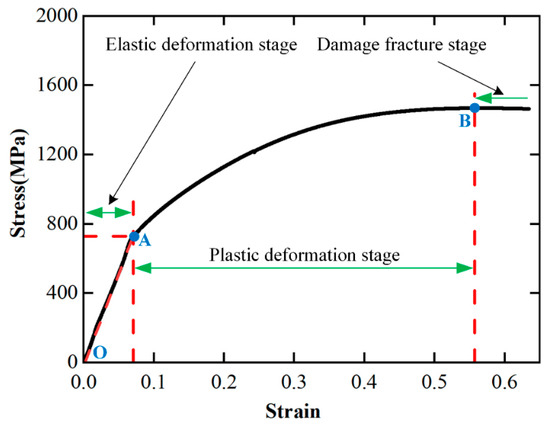 The stress–strain curve of the FGH96 superalloy obtained by the quasi-static compression test is shown in Figure 3. According to Figure 3, in the first stage of the compression process (OA), the material undergoes elastic deformation with the stress increases linearly with the increase in strain. When the strain reaches point A, the growth rate of stress slows down with the increase in strain, indicating that the material enters the plastic deformation stage (AB), showing a clear work hardening phenomenon. When the strain exceeds the strain at point B, the material enters the damage deformation stage which is marked by the decrease in stress with the increase in strain.