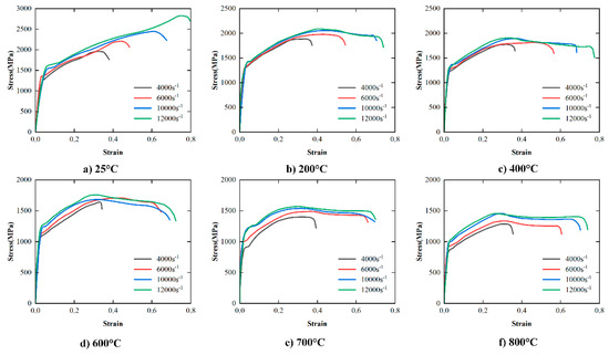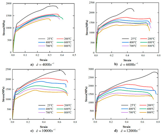 The effect of temperature on the stress–strain curve of FGH96 superalloy at different strain rates (4000 s−1, 6000 s−1, 10,000 s−1, 12,000 s−1) is shown in Figure 5. According to Figure 5a–d, at the same strain rate, the stress in the plastic deformation stage decreases with the increase in temperature, showing a clear temperature softening effect.