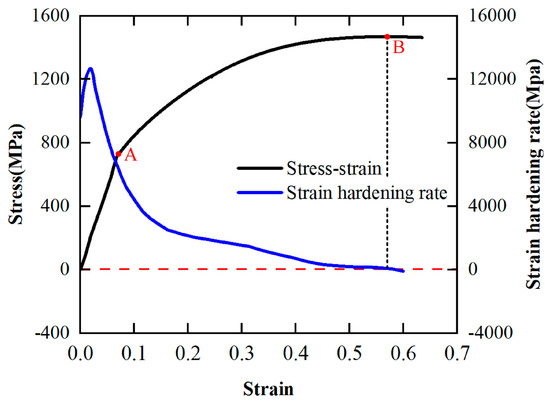The strain hardening rate–strain curve at 700 °C obtained by SHPB tests.