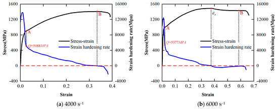 When the temperature is 700 °C, the strain hardening rate–strain curve of the PM superalloy at different strain rates is shown in Figure 7. According to Figure 7, the PM superalloy still exhibits clear strain hardening under high temperature and high strain rate conditions. However, it is worth noting that in the plastic deformation stage, the strain hardening rate Q of the material at the strain rate of 4000 s−1 always remains positive. In contrast, the Q of the material at the strain rate of 6000 s−1 continues to decrease and reaches a negative state after reaching zero. This is because the material not only has the thermal softening effect, but also superimposes the recrystallization softening effect, so that the hardening effect in the plastic deformation stage is greatly weakened, and the flow softening phenomenon appears [23].