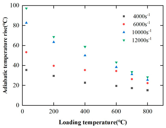 Figure 8 shows the influence of loading temperature on adiabatic temperature rise of FGH96 superalloy under different strain rates. According to Figure 9, at the same strain rate, the adiabatic temperature rise decreases with the increase in temperature. For example, at the strain rate of 12,000 s−1, as the loading temperature increases from 25 °C to 800 °C, the adiabatic temperature rise decreases from 98 °C to 33 °C (reduced by 66%). At the same time, when the strain rate is 4000 s−1, the adiabatic temperature rise decreases from 35 °C to 15 °C with the increase in loading temperature (reduced by 60%). It can be seen that with the decrease in strain rate, the rate of adiabatic temperature rise decreases when the increase in loading temperature is reduced. From the above, with the decrease in strain rate, the reduction rate of adiabatic temperature rise decreases significantly with the increase in loading temperature. At the same loading temperature, the higher the strain rate, the higher the adiabatic temperature rise. For example, at 200 °C, the corresponding adiabatic temperature rises at strain rates of 4000 s−1, 6000 s−1, 10,000 s−1, and 12,000 s−1 are 30 °C, 40 °C, 65 °C, and 70 °C, respectively. At the same time, compared with the temperatures of 25 °C, 200 °C, and 400 °C, the adiabatic temperature rises at 600 °C, 700 °C, and 800 °C decrease significantly with the increase in strain rate.